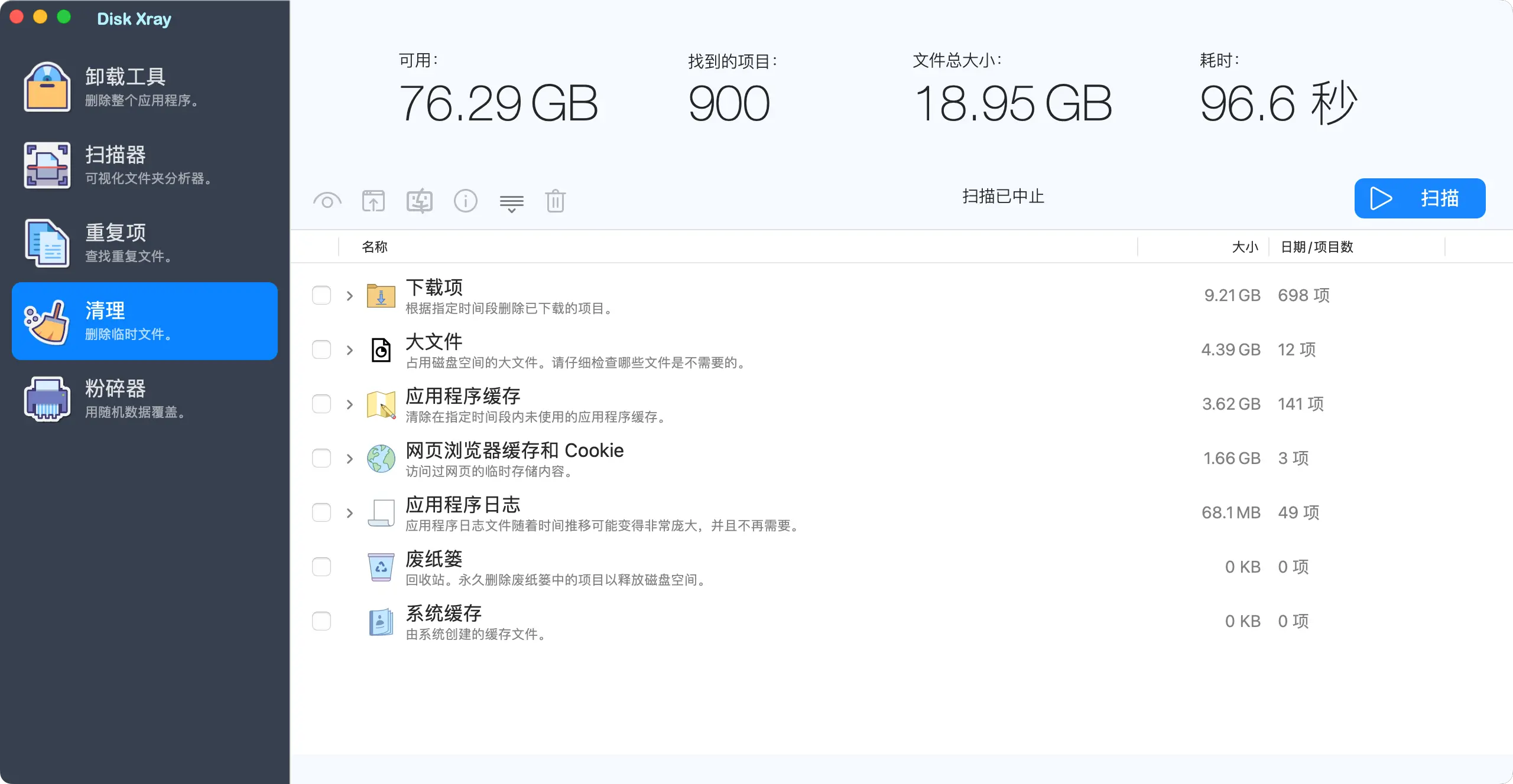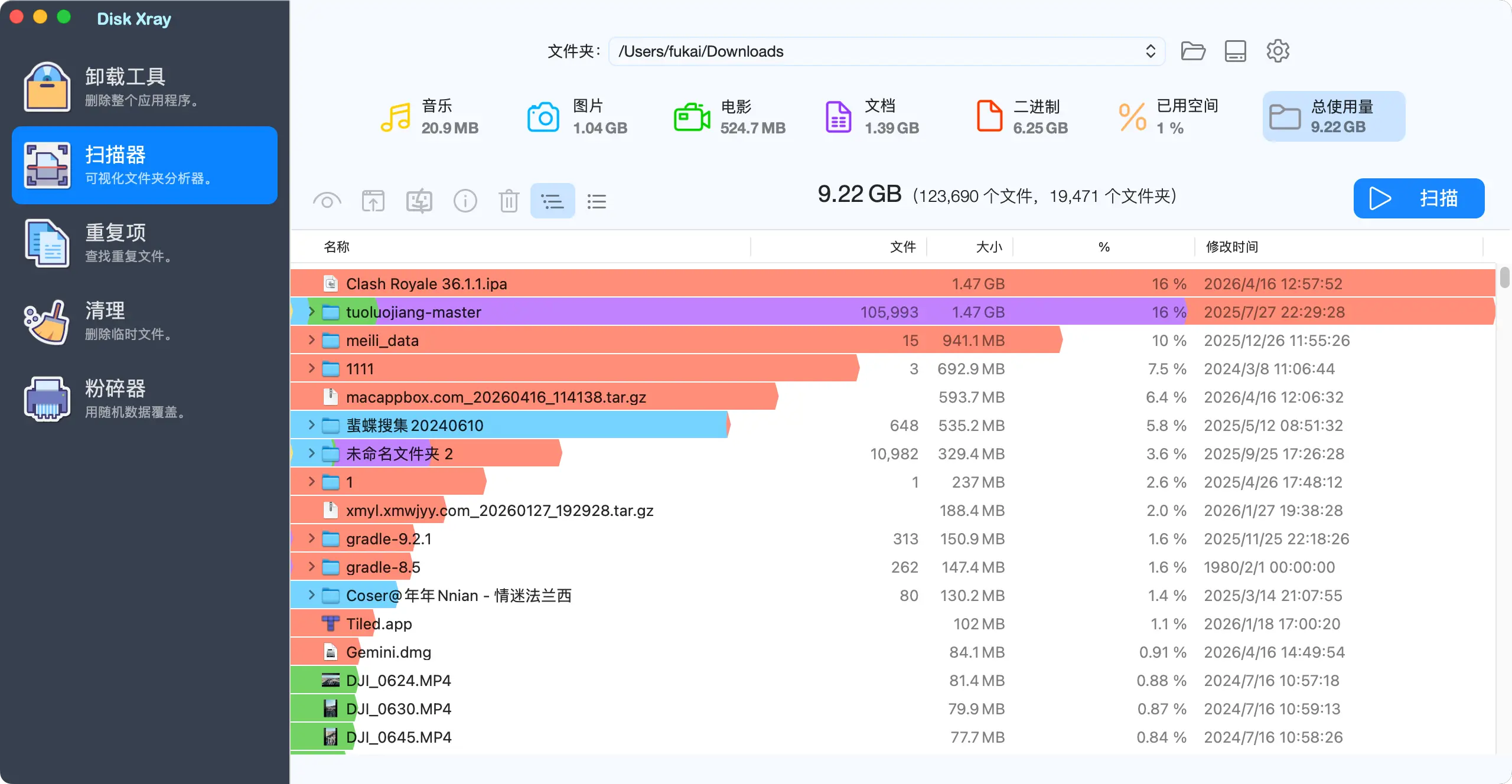 Disk Xray是macOS上一款集磁盘空间分析、重复文件查找、系统缓存清理、应用完整卸载及文件粉碎于一体的工具。支持外接设备扫描,兼容macOS 10.15以上系统,提供直观的文件夹扫描视图与隐私保护清理功能。