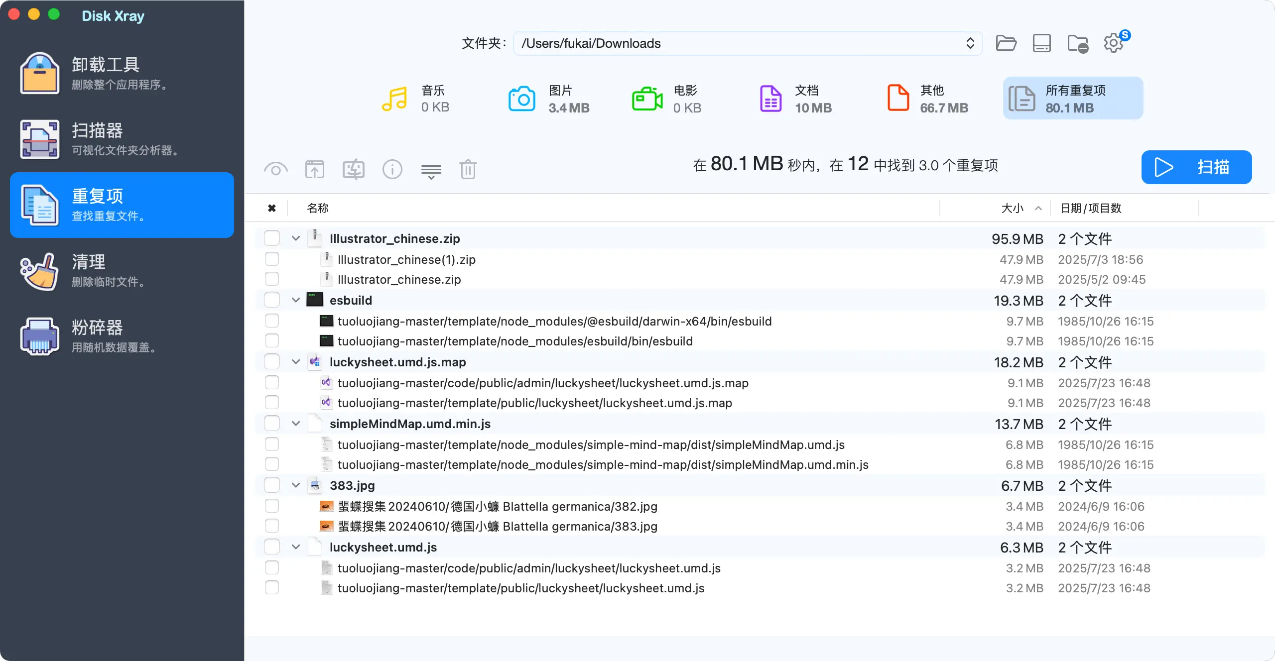 重复文件是占用空间的隐形杀手。Disk Xray能够扫描整个磁盘中重复的照片、文档、音乐、视频等文件,甚至连重复的应用程序包也能识别出来。所有重复文件都会经过逐字节比对,确保检测到的文件在内容上完全一致,避免误判。这一模块让清理变得有据可依,无需手动翻找文件夹一一对照。