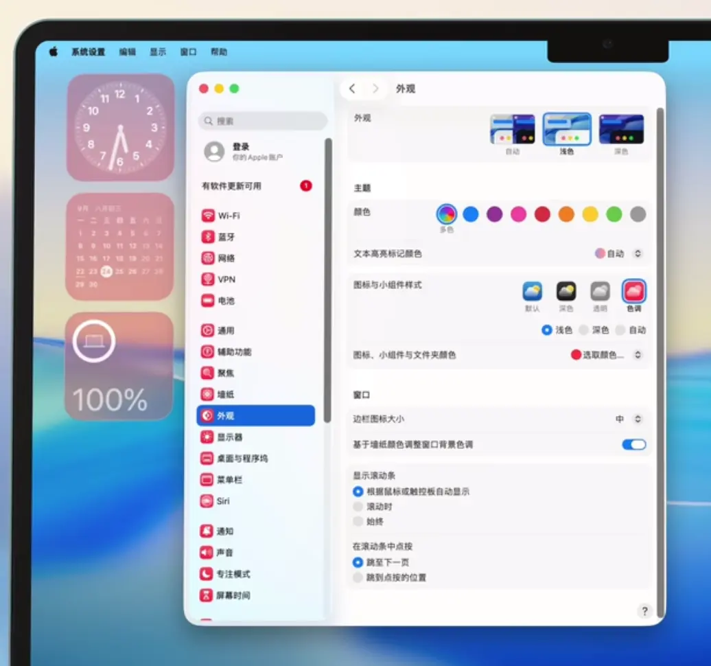 - 透明浅色模式:小组件呈现惊艳的“液态玻璃”效果,但程序坞图标因透明度过高导致可读性下降;