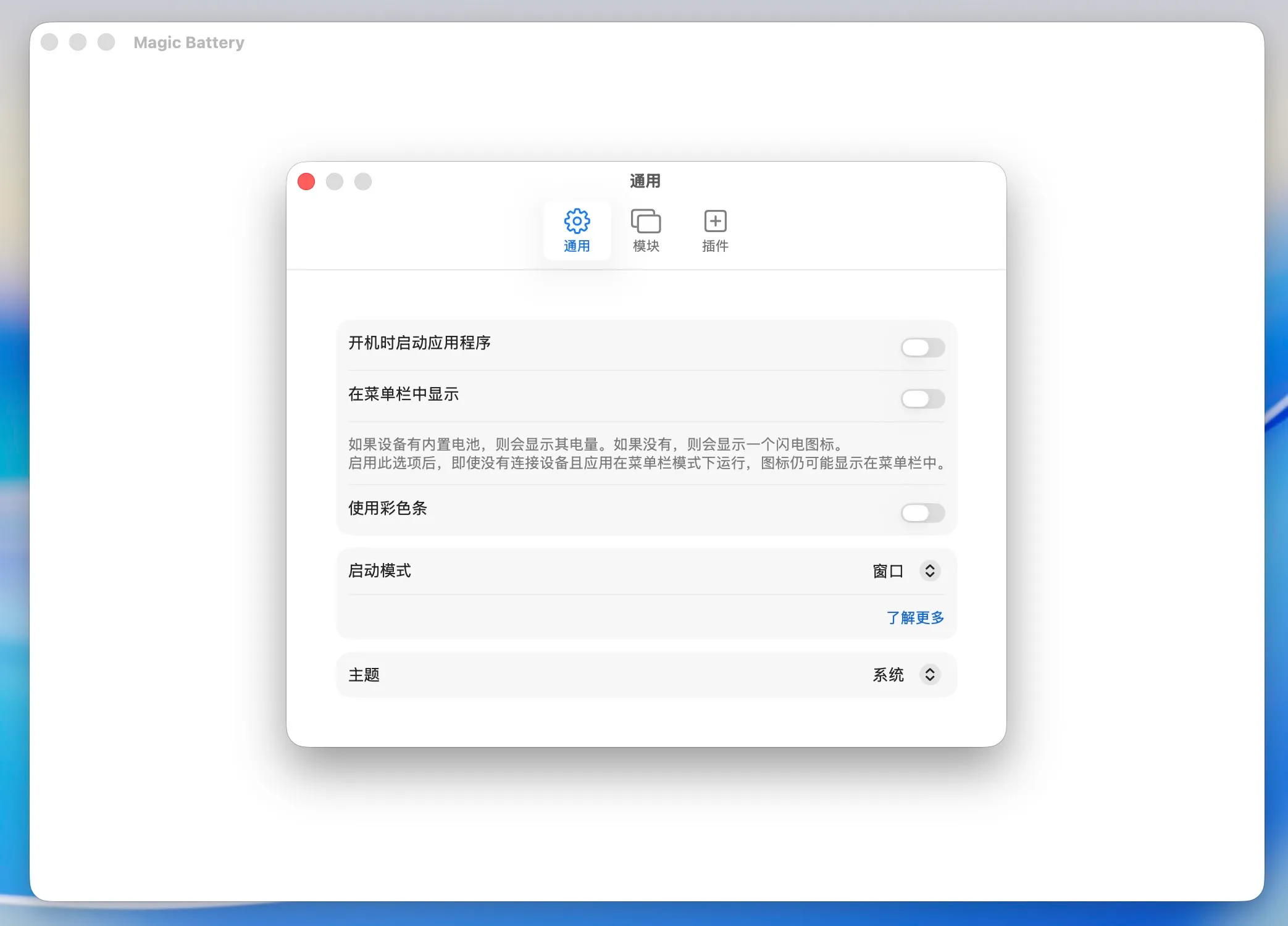 应用还支持自动启动选项,用户可以设置为登录系统时自动运行Magic Battery,确保随时掌握设备电量状态。