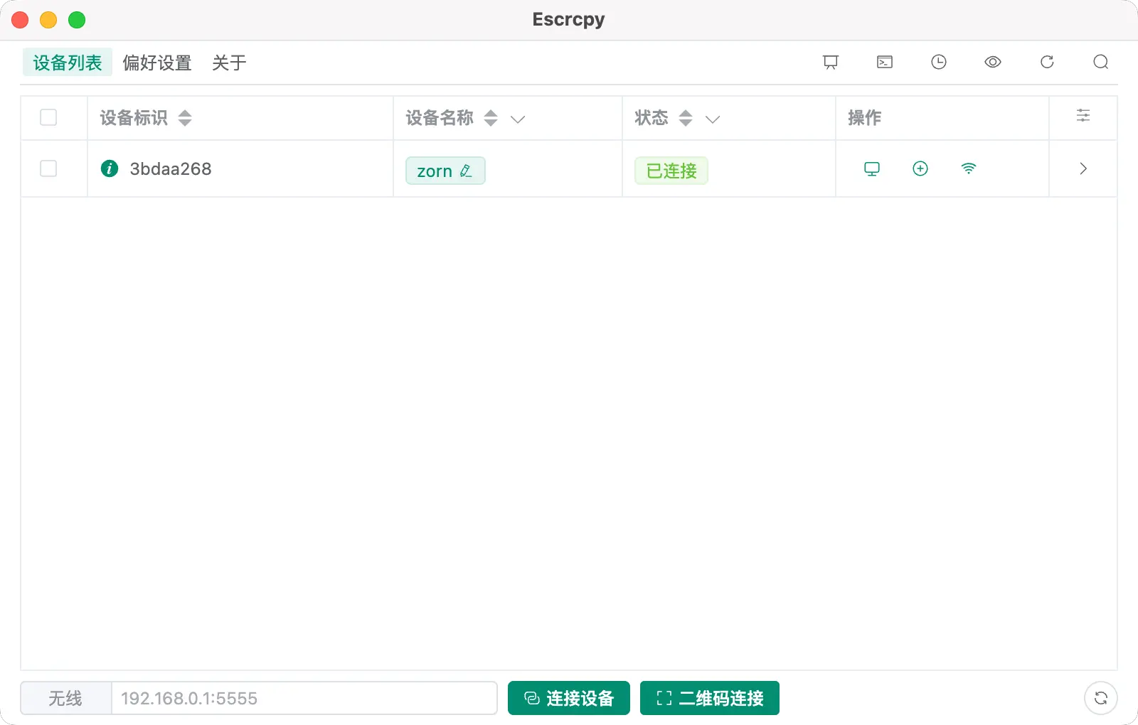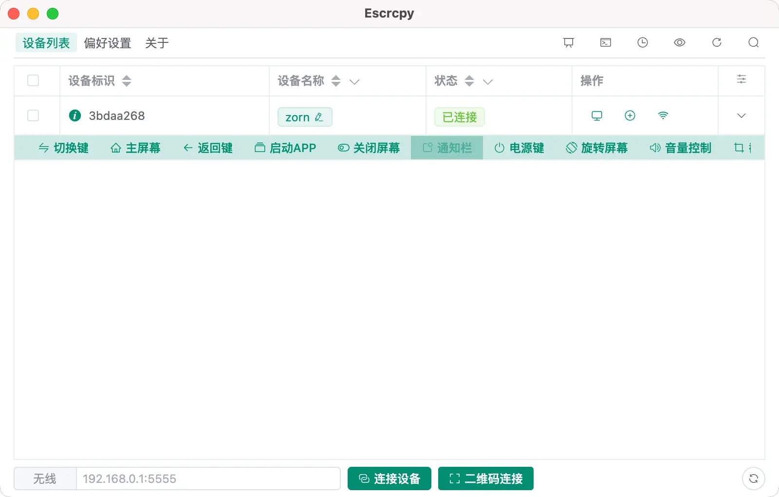这是 Escrcpy 区别于原版 scrcpy 的最大亮点。你无需记忆复杂的命令行参数,所有常用设置都在一个清晰的窗口中:- 一键连接: 连接 USB 或配置好 Wi-Fi 后,在列表中选择设备即可连接。