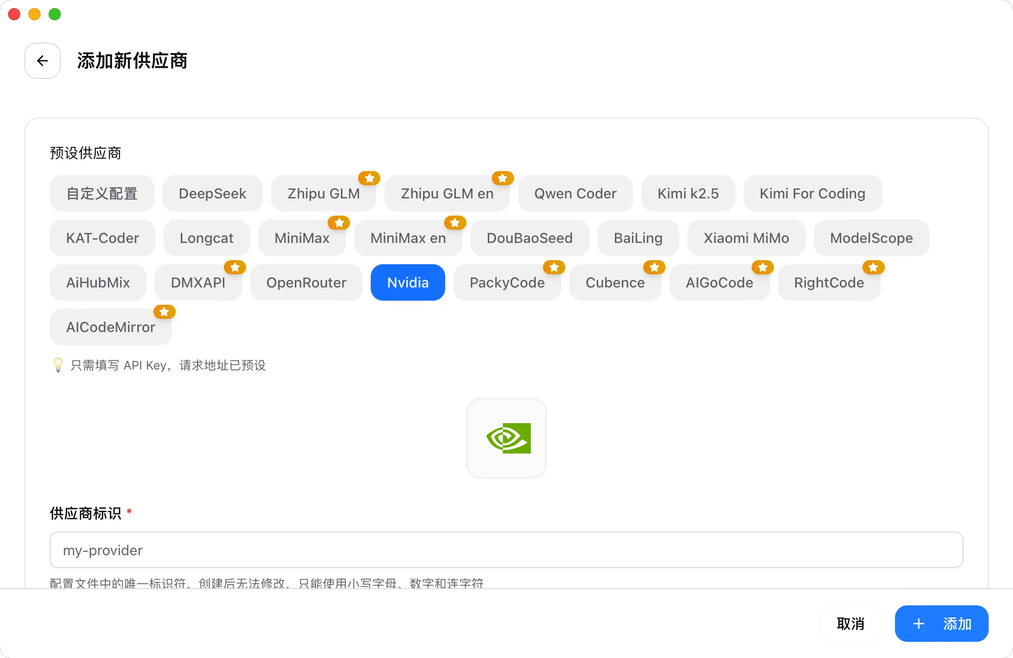 通过这个新功能,你可以轻松接入 NVIDIA 免费 API 额度(已集成预设模板),并实测可稳定调用 Kimi 2.5、MiniMax M2.1、GLM-4.7 等国产模型。对于高频开发者来说,这套方案的综合成本据说可以 降低 70% 以上。