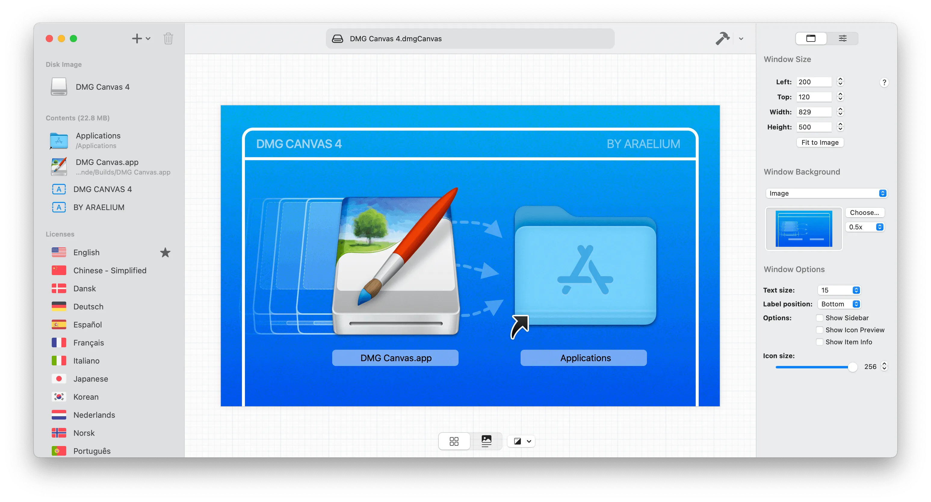 这是 DMG Canvas 最大的亮点。你不需要记忆任何命令行参数,而是通过一个所见即所得的图形界面来设计你的 DMG 卷宗。