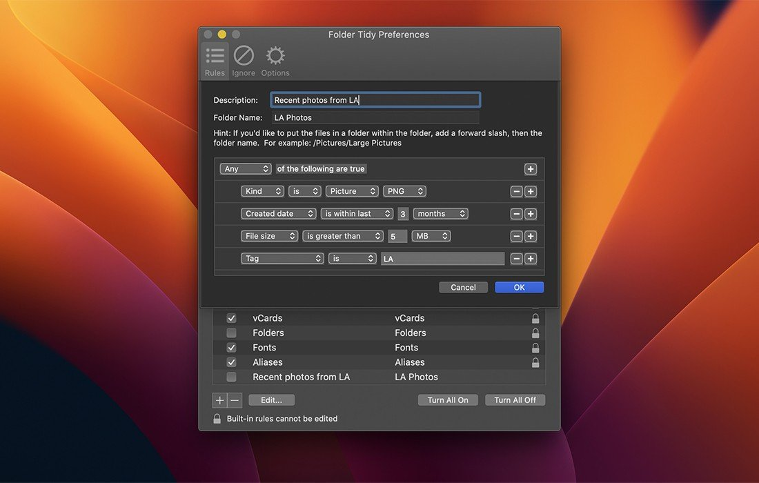 类似于 Finder 的搜索功能。您可以对文件属性(例如“种类”、“创建日期”、“大小”等)使用多个条件。例如:将所有扩展名为“docx”且包含“invoice”一词且上次修改时间在过去一年内的文件移动到名为“Invoices”的文件夹中。