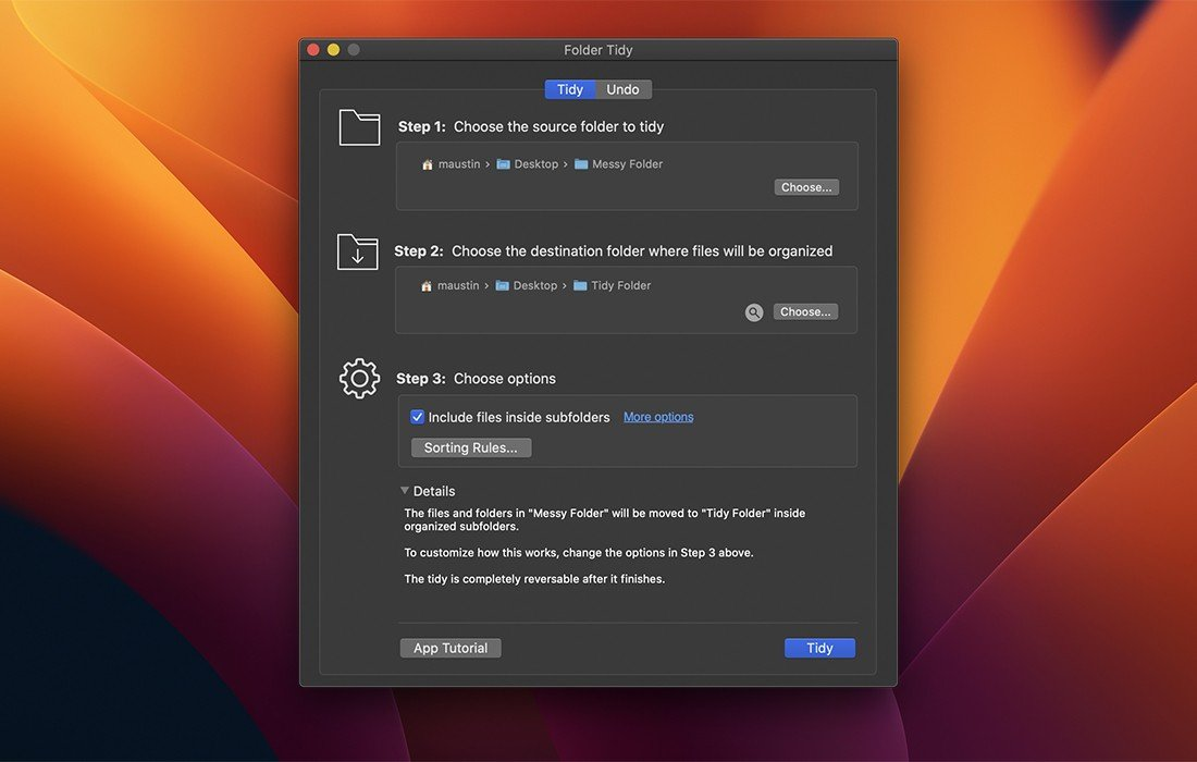 Folder Tidy 的设计注重用户友好性,同时为高级用户提供灵活性。初始步骤包括设置要整理的文件夹并指定整理后文件的存储位置。运行文件夹整理需要三个主要步骤。