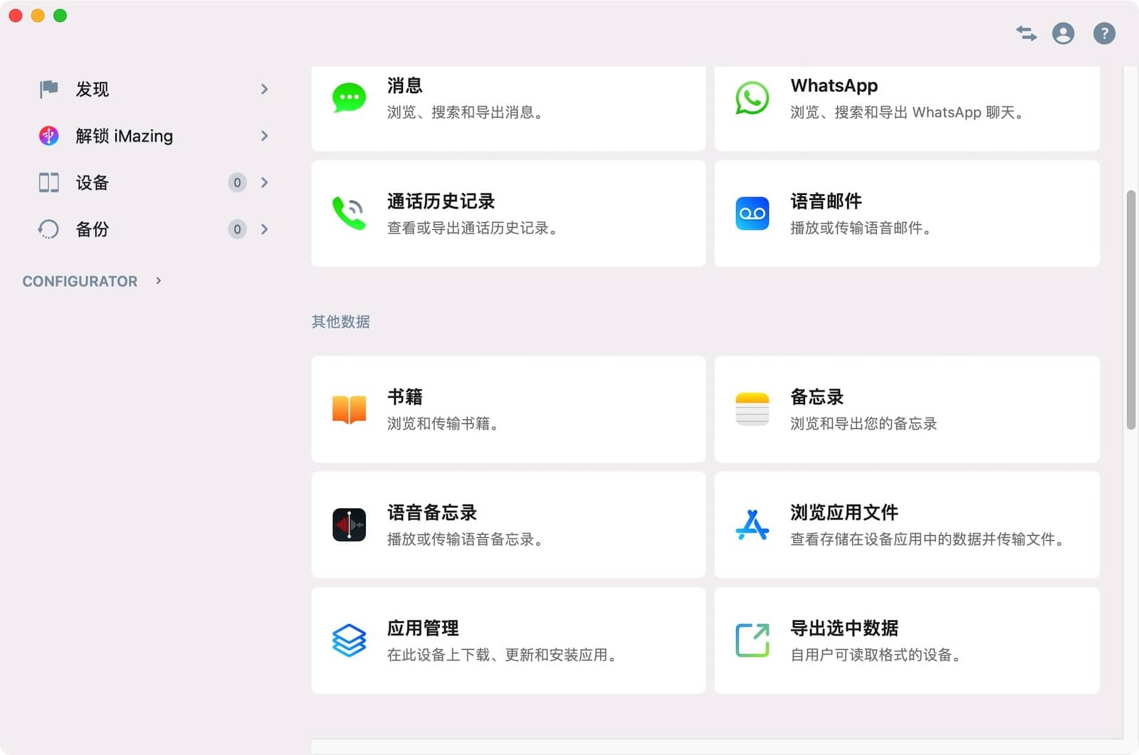 - 更灵活:iMazing 提供更细粒度的控制,比如单独备份或恢复某项数据。