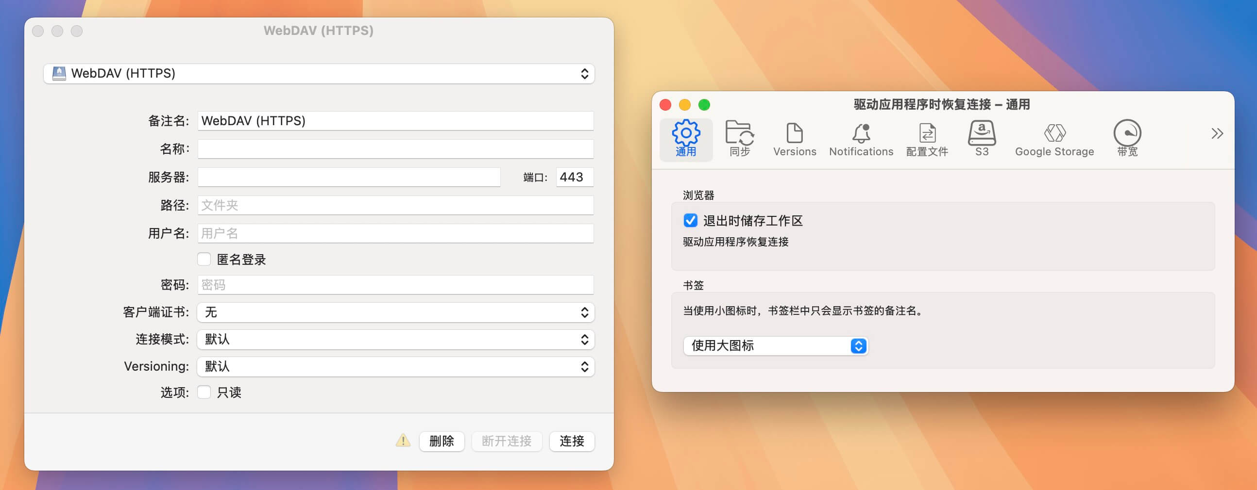 Mountain Duck 是一款将各个云存储挂载到macOS上,可以当做本地磁盘一样读写文件,支持FTP、SFTP、WebDAV、Azure云存储、亚马逊S3等多种协议和云盘。