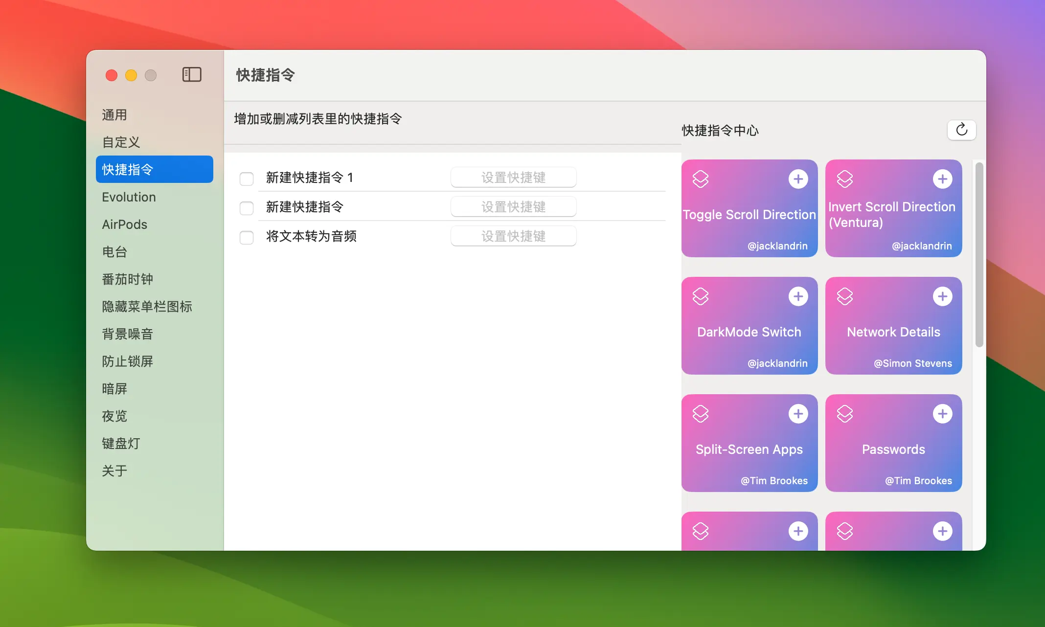 - Shortcuts(快捷指令):可以运行你自定义的 macOS 快捷指令。