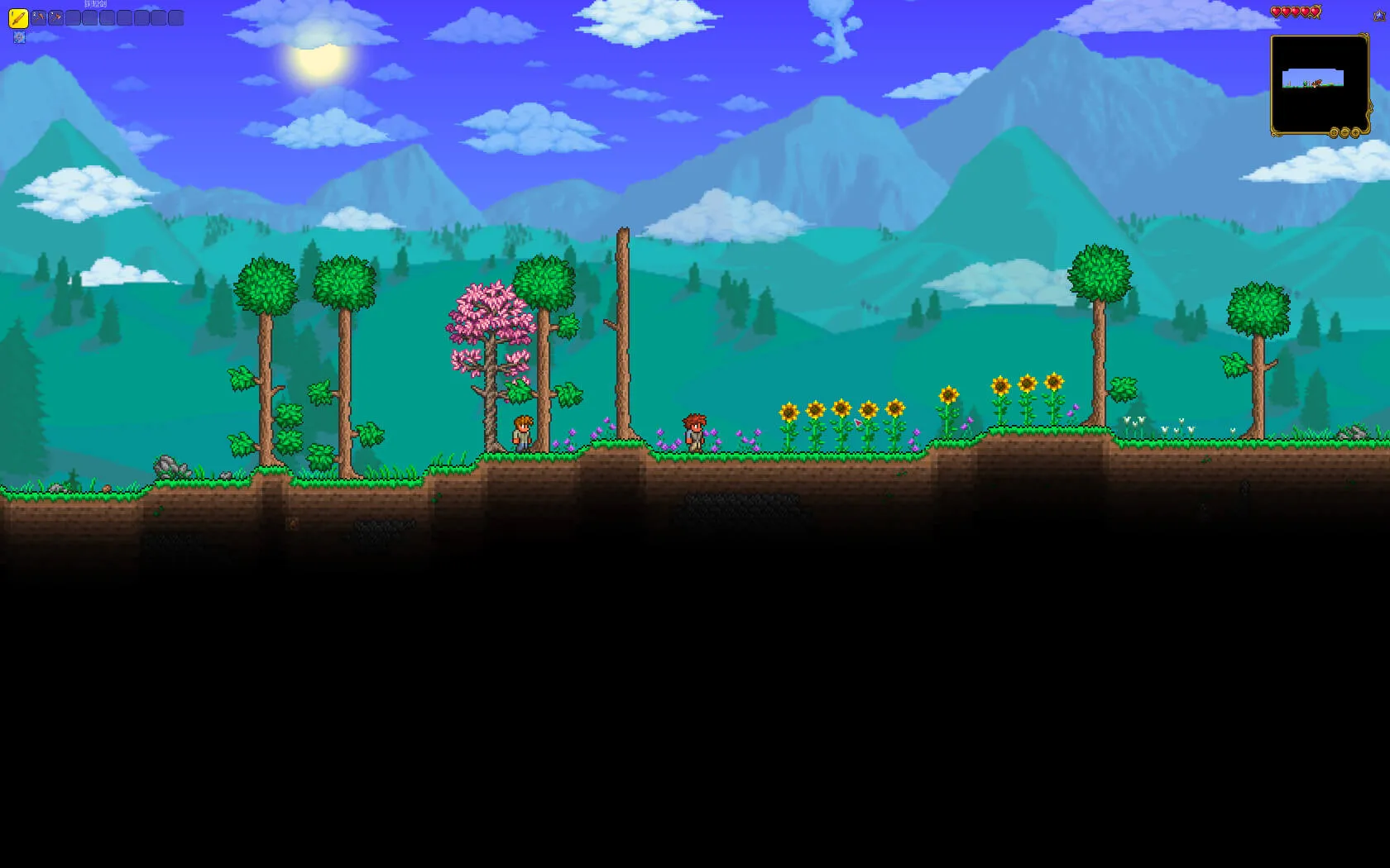Terraria的核心玩法围绕高度自由的沙盒机制展开。玩家在一个随机生成的2D世界中,从零开始生存:挖掘资源如木材、矿石,制作工具、武器和装备,建造庇护所和复杂结构以抵御敌人。游戏包含昼夜循环和动态天气系统,影响怪物生成和资源获取。战斗系统多样,玩家需面对数百种敌人和多个Boss,挑战逐步升级,解锁新区域如地狱、丛林和太空。更新内容引入了“Journey模式”,允许玩家调整游戏规则,进行创造性实验;新增的事件和任务链,如“月亮领主”事件,扩展了终局内容。多人合作支持最多8名玩家,鼓励团队协作探索和PvP对战,增加了社交互动维度。