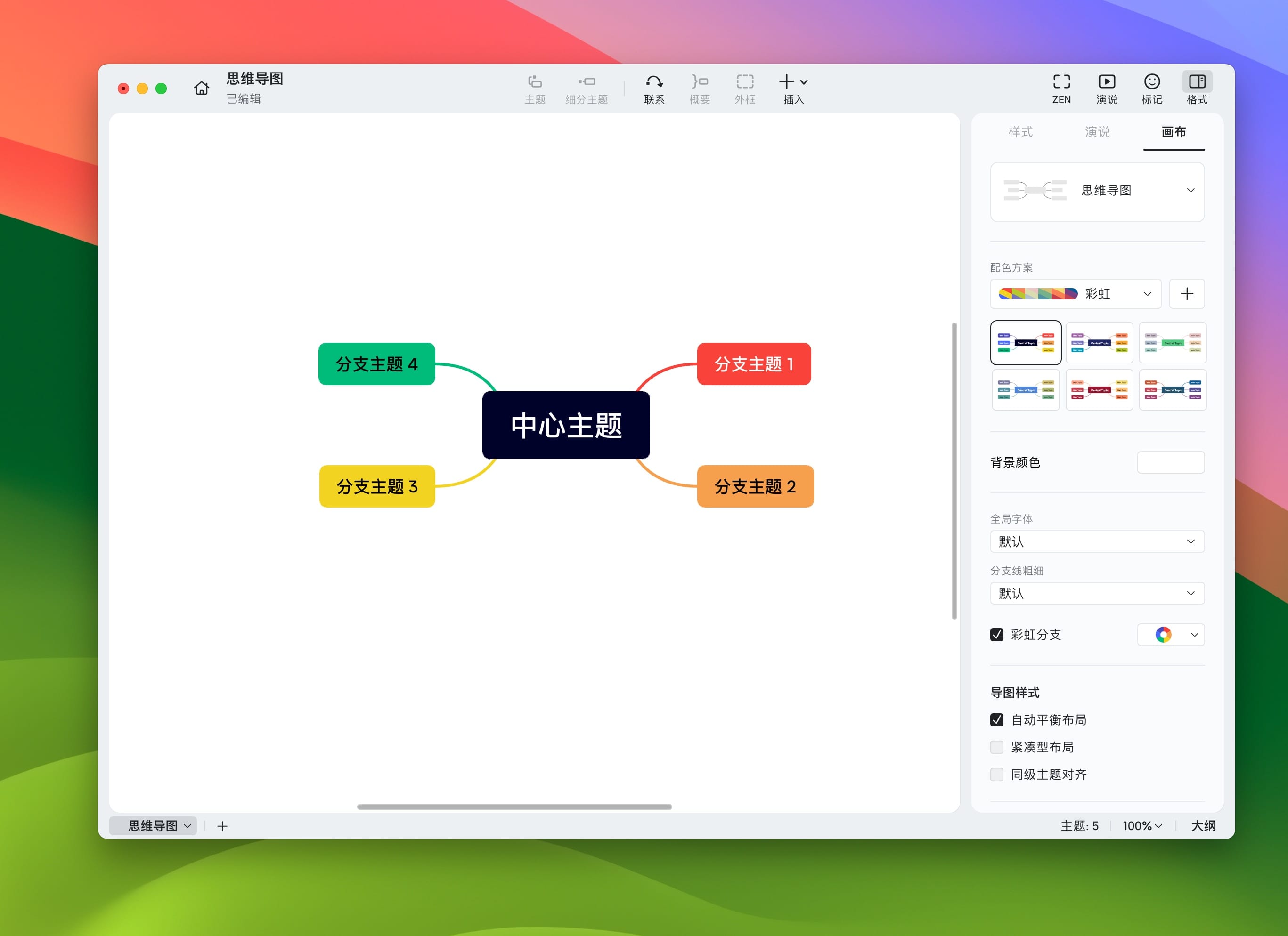 - 改变样式: 选中某个主题,在软件侧边栏或顶部菜单,可以修改它的填充颜色、文字颜色、边框形状、线条粗细等。